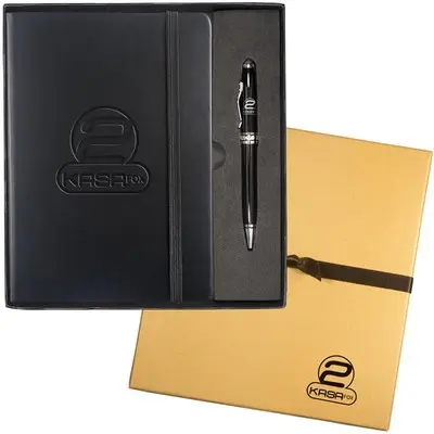 80 lined pages, elastic closure, and a bookmark with a pocket inside the back cover. Includes an aluminum twist-action pen with a soft silicone tip for touchscreen devices. Ink: Black, medium-point. Dimensions: 8.625" D