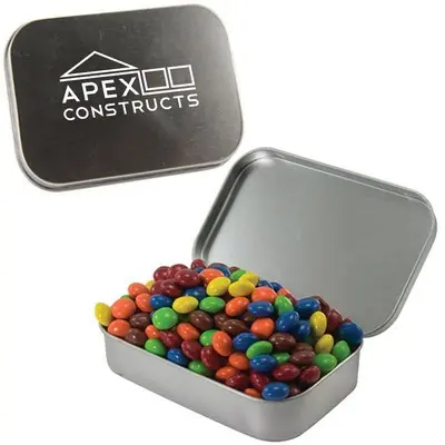 This premium large hinged tin is crafted in China and filled with delicious treats in the USA. It features a vibrant laminated 4-color process decal or a sleek 1-color direct imprint. Available in white, silver, or black, the tin can be filled with a variety of options including Signature Peppermints, Cinnamon Red Hots, Jelly Beans, Gum, Chocolate Littles (candy-coated chocolate), Colored Candy, Sugar-Free Mints, Candy Hearts, Candy Stars, Sugar-Free Gum, and Chocolate Espresso Beans. Dimensions are 2" W x 3" H x 3" D.