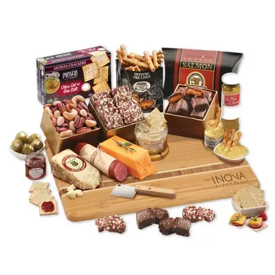 When you can't decide what to give, give some of everything! We include smooth chocolates, sweet and crunchy nuts, gourmet Wisconsin cheese and sausage, and much more. This amazing feast comes packaged with an oversized, sustainable bamboo board (15" x 11"), stylishly firebranded with your logo. It's an experience that every recipient is guaranteed to remember. Serves 14-20. Complies with CPSIA, FDA, Prop 65. 15" L x 11" W x 0.75" H